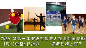 將於 1 月 16 日至 4 月 24 日逢週五晚上舉行。本季有羽毛球班、太極拳班、排舞班及匹克球,費用由 $20-30;鼓勵本會已受洗兄姊可邀請未信親友參加。若未能邀請未信朋友,如願意接受友誼佈道訓練,並願意在週五外展事奉的兄姊亦可報名。額滿即止。